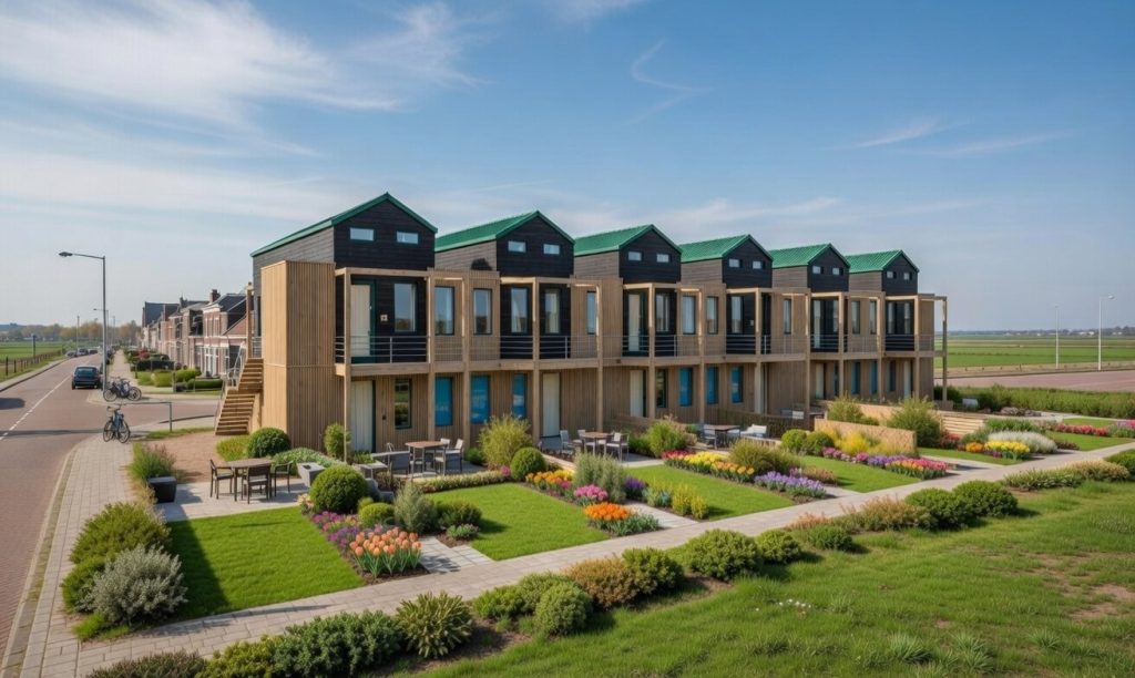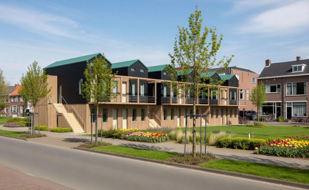 Dit garandeert constante kwaliteit, efficiëntie en een kortere bouwtijd. Op locatie worden de modules zorgvuldig geassembleerd tot een duurzaam en toekomstbestendig woongebouw, waarin collectief wonen en individuele privacy naadloos samenkomen.