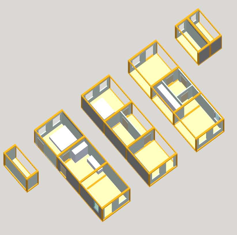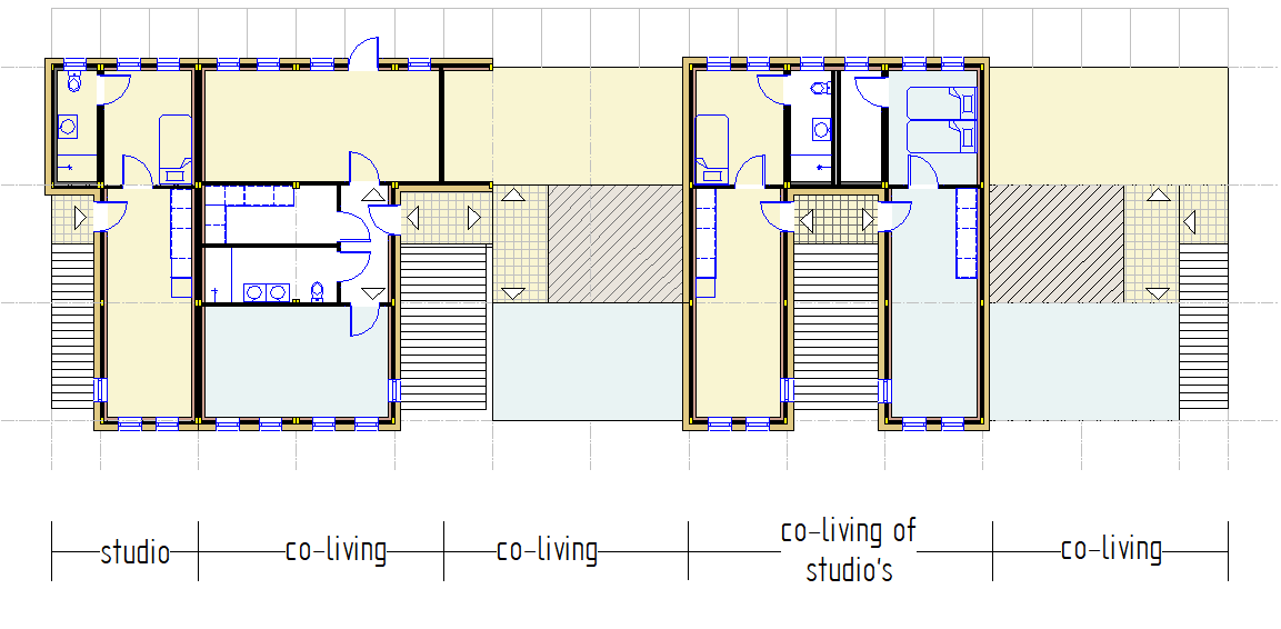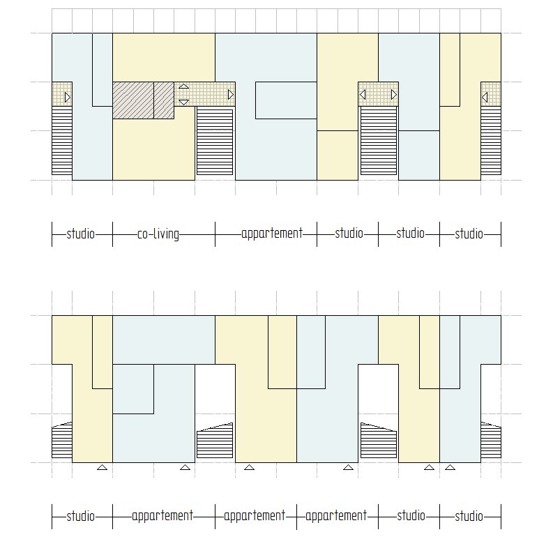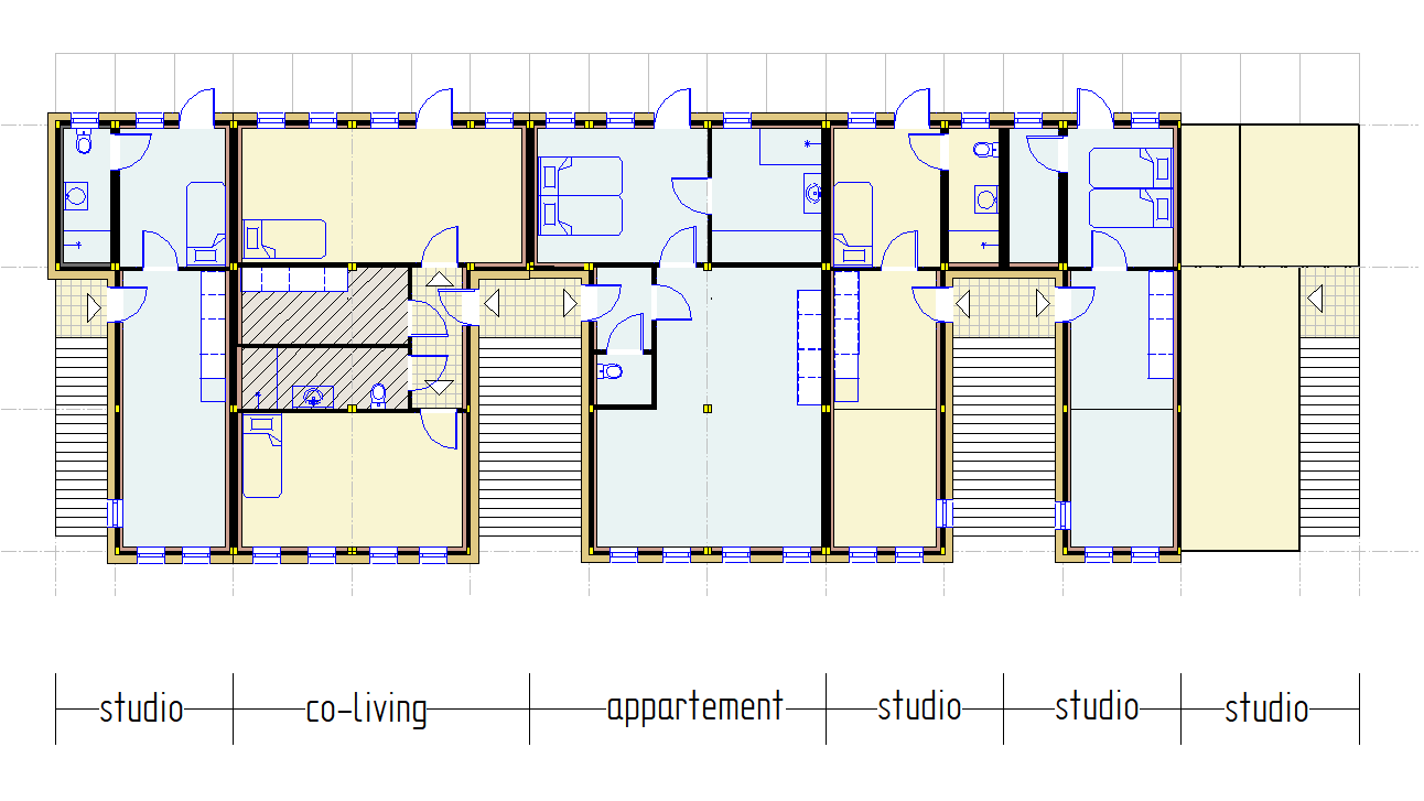 Het concept waarin co-living wordt gecombineerd met zelfstandige appartementen en studio’s is hieronder uitgewerkt. De woningen zijn opgebouwd uit hoogwaardige 3D-modules die in de fabriek volledig worden geprefabriceerd.
